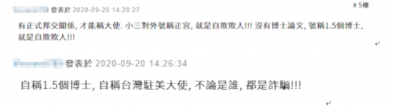 也有人称此举是“自欺欺人”,“自称博士,自称‘台湾驻美大使’,不论是谁,都是诈骗!”