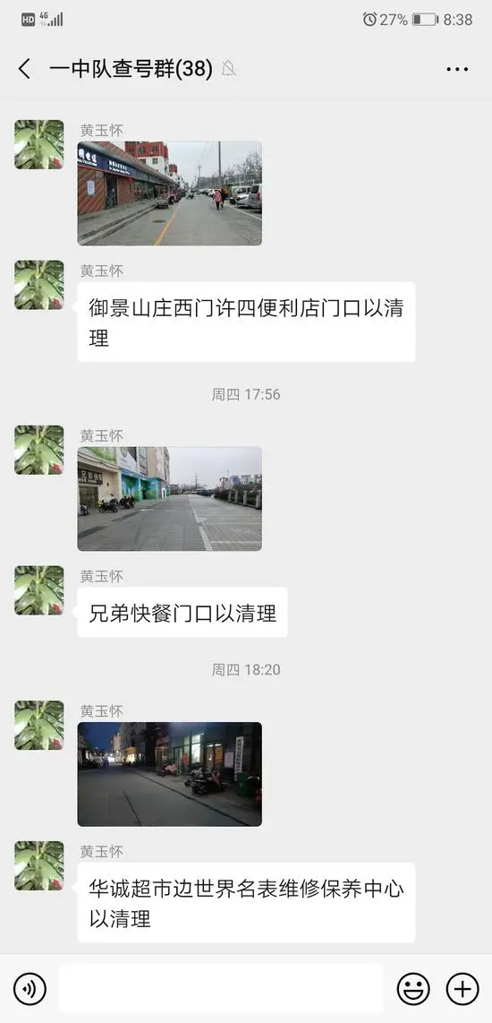 2月27日,“今天事不少,确实有点累,你们先吃,点名我就不去啦,我还在路面上。”在路面进行交通整治的黄玉怀接到了中队长司慧威催他吃饭的电话,还在执勤的他拒绝了中队长的好意邀请,决定到执勤路面上再看看。17时34分,“御景山庄西门便利店门口已清理。”17时56分,“兄弟快餐门口已清理。”18时20分,“华诚超市门口已清理。”这3条信息,是黄玉怀在中队工作微信群中发的最后几条信息,也成为了他与同志们的最后告别。
