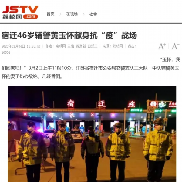 新冠肺炎疫情防控期间,他第一时间写下请战书,在防控任务繁重的新扬高速宿迁东出口检查点参与执勤。检查点撤离后,他主动放弃单位安排的轮休,坚持配合中队民警走访辖区京东宿迁物流园等企业,保障复工复产。2月27日晚,连续25天坚守在疫情防控一线的他,在宿豫区万达商城周边疏导完交通回到家后,突发脑干出血,经过医院5天5夜的抢救,不幸于3月2日离世,年仅46岁。把人生中最美好的时光奉献给了最挚爱的公安事业,把生命的最后时刻留在了最伟大的抗“疫”战场。