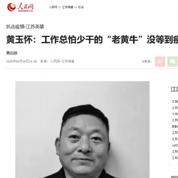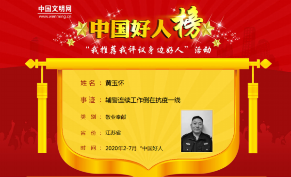 黄玉怀以执着的坚守、履职平凡岗位默默奉献,3月9日,宿迁市总工会追授黄玉怀同志“宿迁市五一劳动奖章”,3月12日,宿迁市委、市政府追授在战“疫”中牺牲的辅警黄玉怀同志“宿迁市新冠肺炎疫情防控工作先进个人”称号。江苏省副省长、省公安厅厅长刘旸,宿迁市政府市长王昊等领导相继批示,对黄玉怀同志的不幸去世表示沉痛哀悼,对其家人致以最诚恳的慰问和关怀照顾,号召广大警务人员向黄玉怀同志学习,一心为民铸警魂。人民日报、央广网、新华网等媒体相继对他的事迹进行了报道。