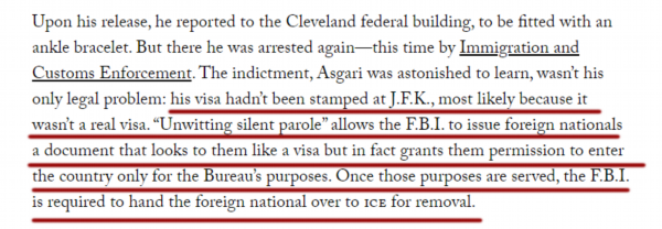 联邦调查局会向“目标”发放一份看起来像签证的文件,但该文件实际上只允许他们为实现联邦调查局的目的进入美国。