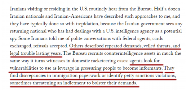 实际上,经常访问或居住在美国的伊朗人都会经常收到联邦调查局的来信或名片。接着他们就会因为自身的问题和困境被要挟,迫使他们成为FBI的间谍或线人。