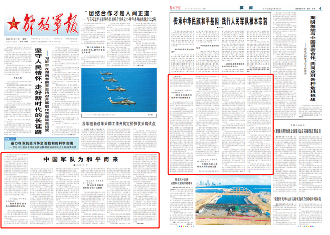 “中国始终是世界和平的建设者、全球发展的贡献者、国际秩序的维护者,中国军队始终是维护世界和平的坚定力量。中国军队将一如既往开展国际军事交流合作,共同应对全球性安全挑战,积极履行同中国国际地位相称的责任和义务,为推动构建人类命运共同体积极贡献力量。”习主席向世界郑重承诺。