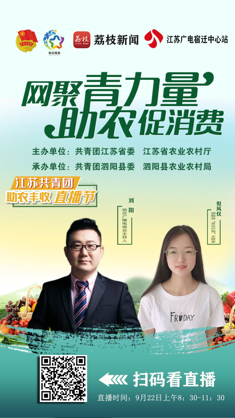 为庆祝“中国农民丰收节”,进一步推进“青春四进 建功乡村”行动, 9月22日上午,共青团江苏省委联合省农业农村厅举办江苏共青团助农丰收直播节活动,共青团泗阳县委承办这场“网聚青力量,助农促消费”直播。>>直播回放