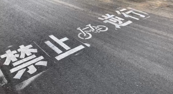 瞧,这就是执勤民警说的地标,白色的字体非常醒目。一般来说,只要骑行路过,大家都会注意到。不一会,又一对父子因为在人行道逆向行驶被执勤民警拦了下来。