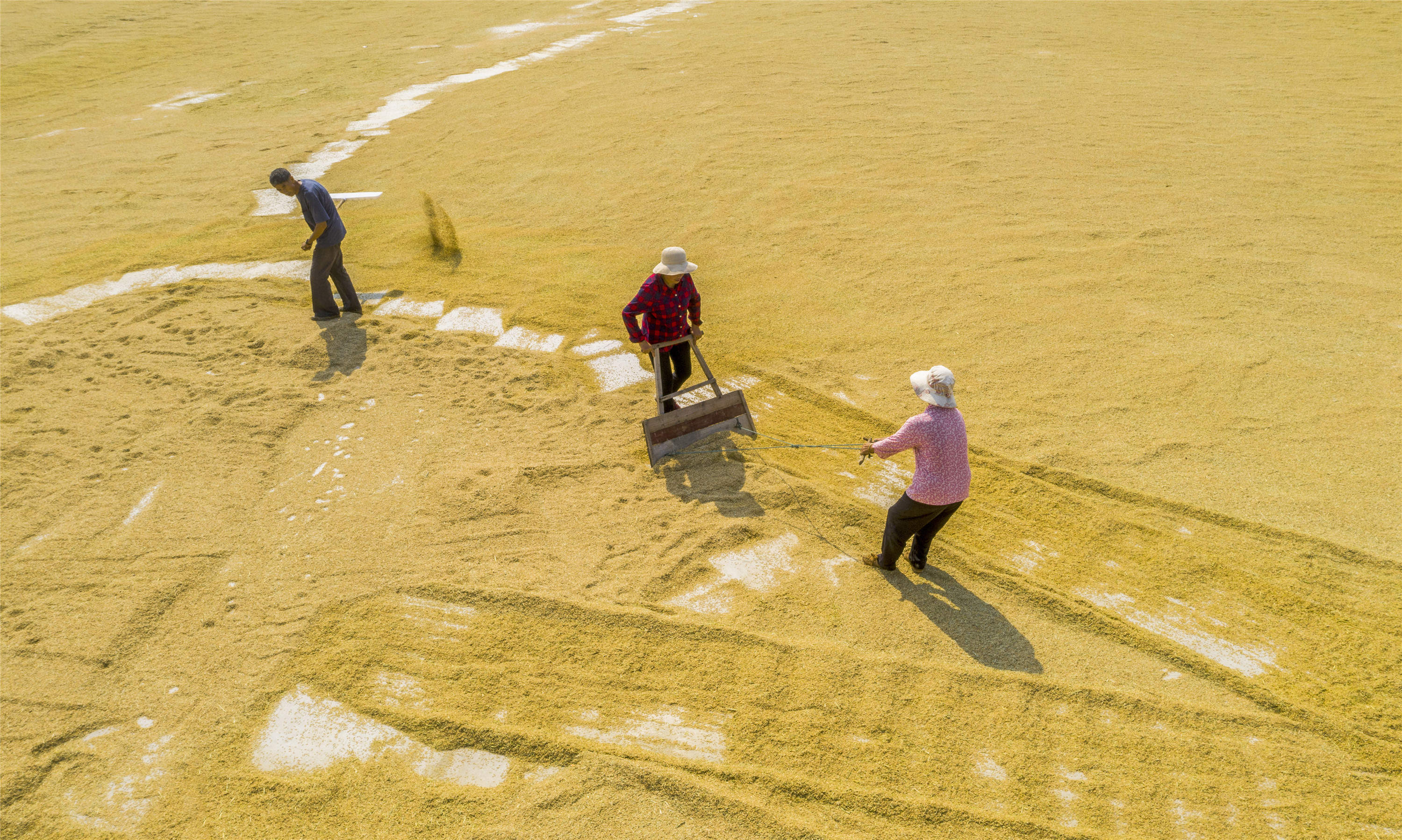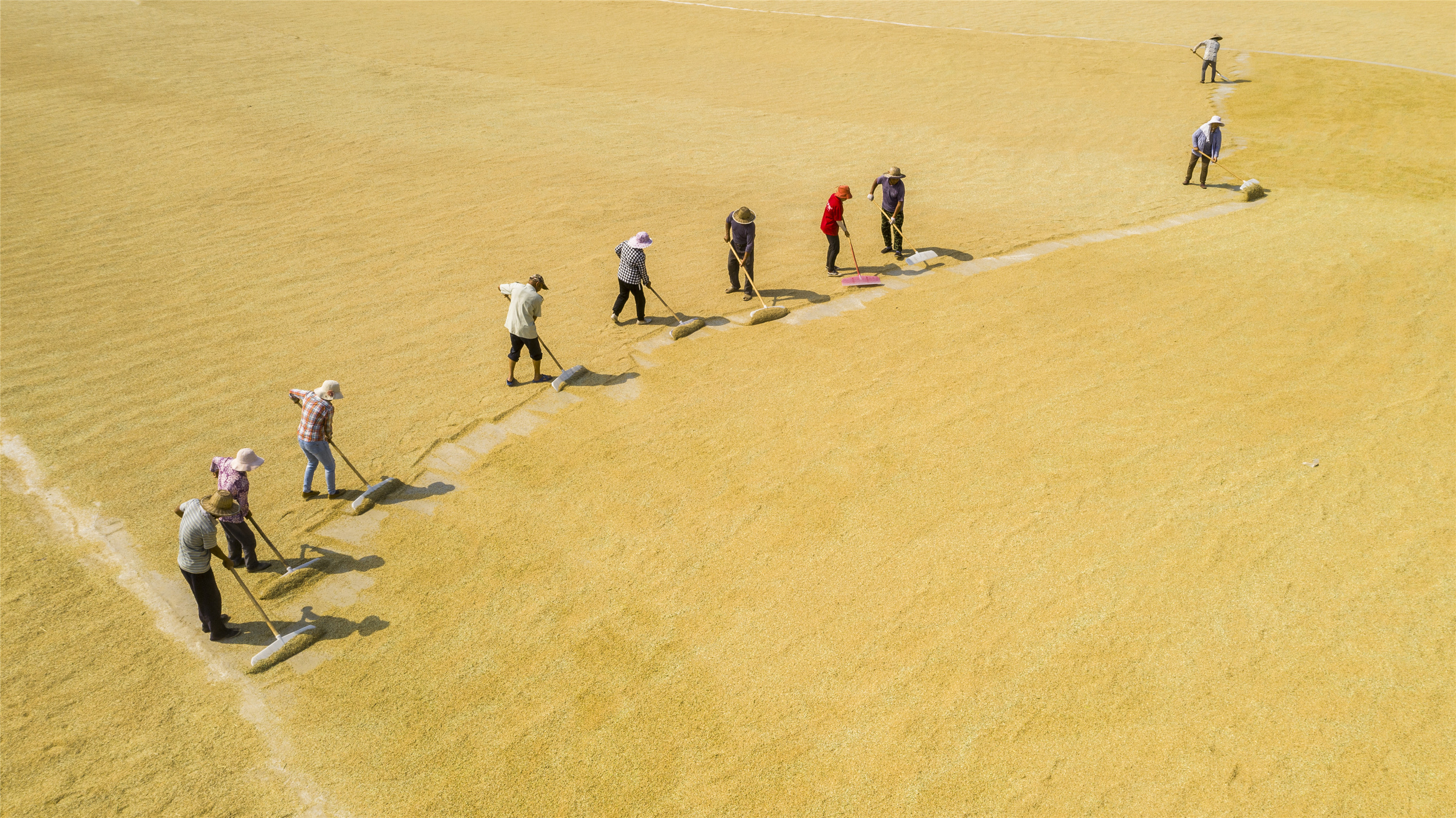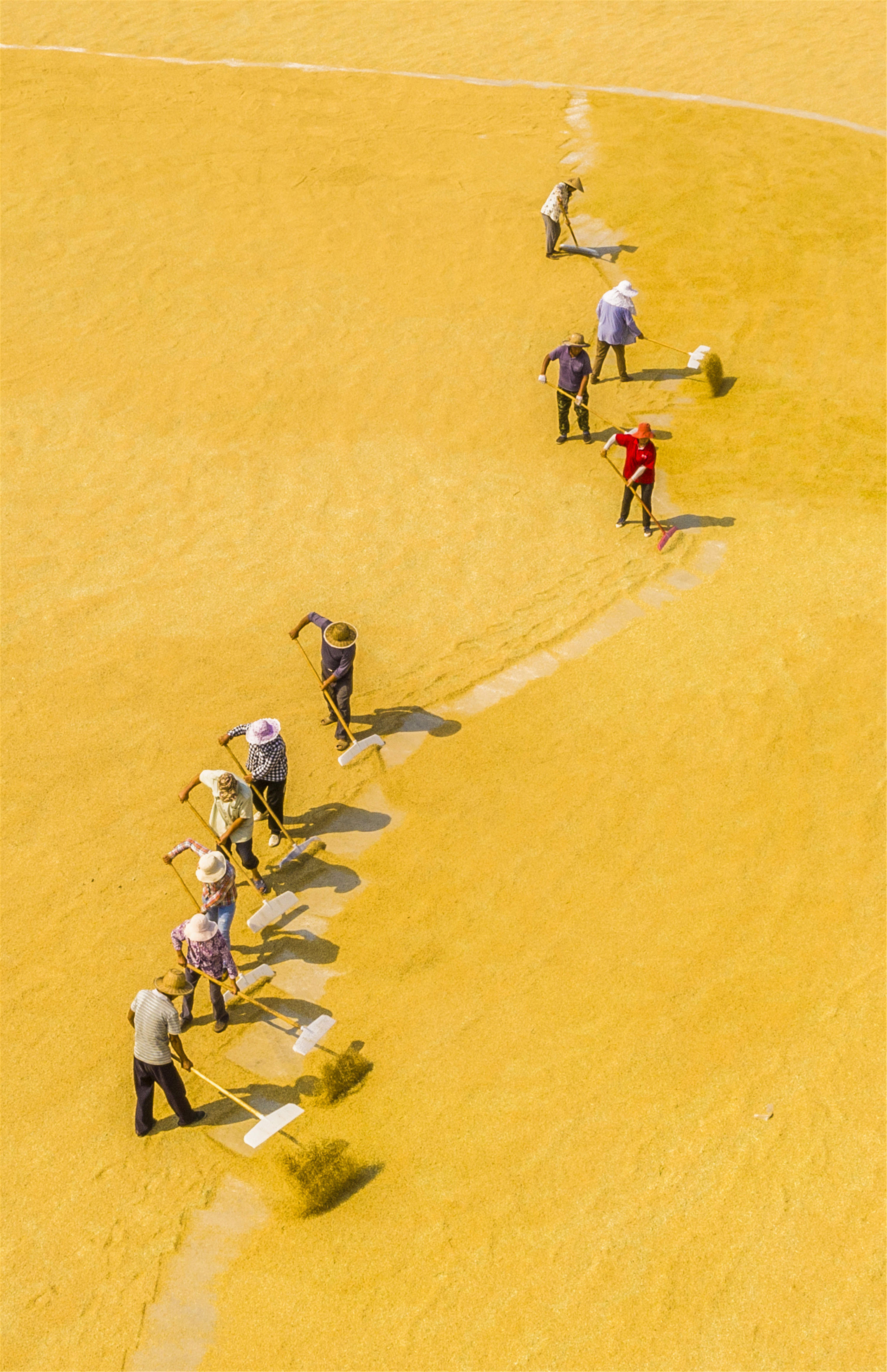 9月20日,江苏省宿迁市泗洪县石集乡一家庭农场7000亩制种水稻开镰收割,从而拉开了全县98万亩水稻收割序幕。无人机高空俯拍,一台台大型收割机在稻田间来回穿梭,场面蔚为壮观;金色的晒场,农民们正在紧张的晾晒稻谷,犹如一幅巨大的油画,美不胜收。