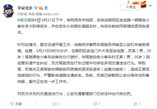 恶意别车还泼咖啡 北京警方通报来了