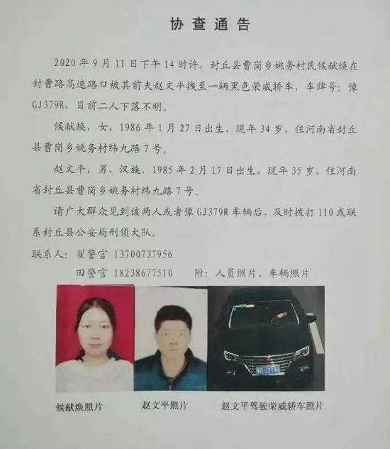大河报9月23日消息,在新乡封丘县封曹高速路口,34岁女子侯某焕被前夫赵某平拽上车,之后二人下落不明。目前,女方家人已报警,警方发布协查通告介入调查。