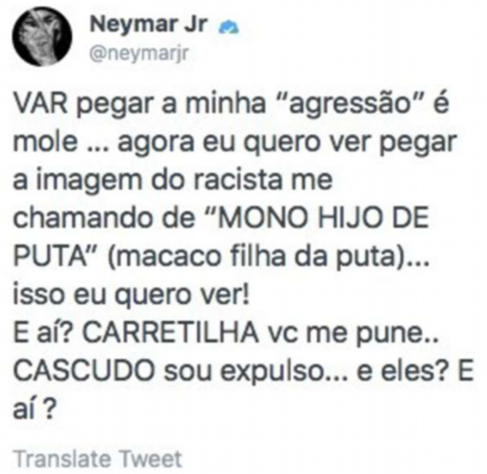 赛后,因殴打马赛队的西班牙籍后卫球员阿尔瓦罗·冈萨雷斯(álvaro González)而最先被罚下的内马尔,率先对马赛队提出种族主义的控告,称他是被冈萨雷斯辱骂为“猴子”才会情绪失控。