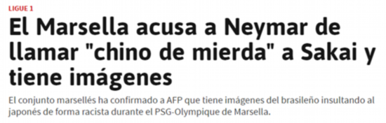 西班牙《阿斯报》则进一步披露说,就在内马尔与冈萨雷斯发生冲突前,这名巴西球星曾经用“中国垃圾”(chino de mierda)一词对马赛队的日本籍后卫球员酒井宏树进行了种族主义的侮辱。而且马赛队也有视频证据。
