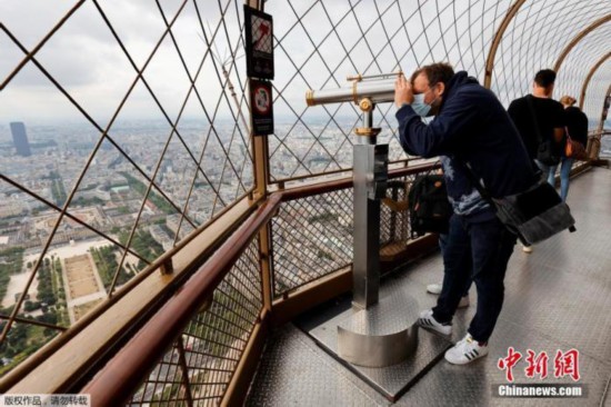 资料图:当地时间7月15日,法国巴黎埃菲尔铁塔顶层开放,一名男子通过望远镜俯瞰巴黎。