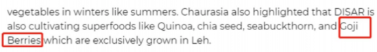 紧接着,报道提到“种菜”的问题。由于印军将在边境地区度过严冬,印度国防研究与发展组织(DRDO)决定克服当地气候上的恶劣条件,利用温室技术等手段,为部队种植新鲜蔬菜。同时,DRDO下属的研究机构正在加紧制定相关方案。机构主任乔拉西亚(Om Prakash Chaurasia)博士说,现在的重点是让官兵在冬天吃到和夏天一样多的蔬菜。乔拉西亚强调说,机构目前还正在种植一些“超级食物”,比如藜麦、奇亚籽、沙棘和枸杞。