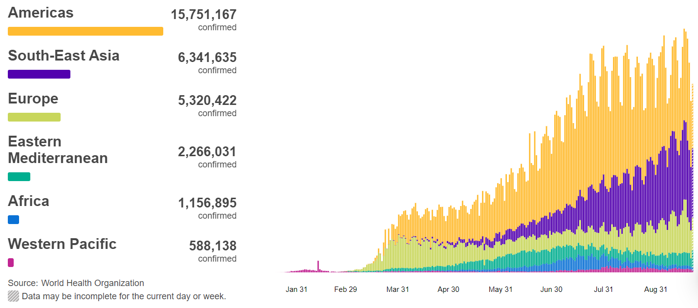 当地时间9月23日,世卫组织发布全球各地区疫情数据,全球新增新冠肺炎确诊病例246165例,死亡新增4520例。疫情最为严重的美洲区域确诊病例达到15751167例(新增84250例),死亡533680例(新增1972例)。