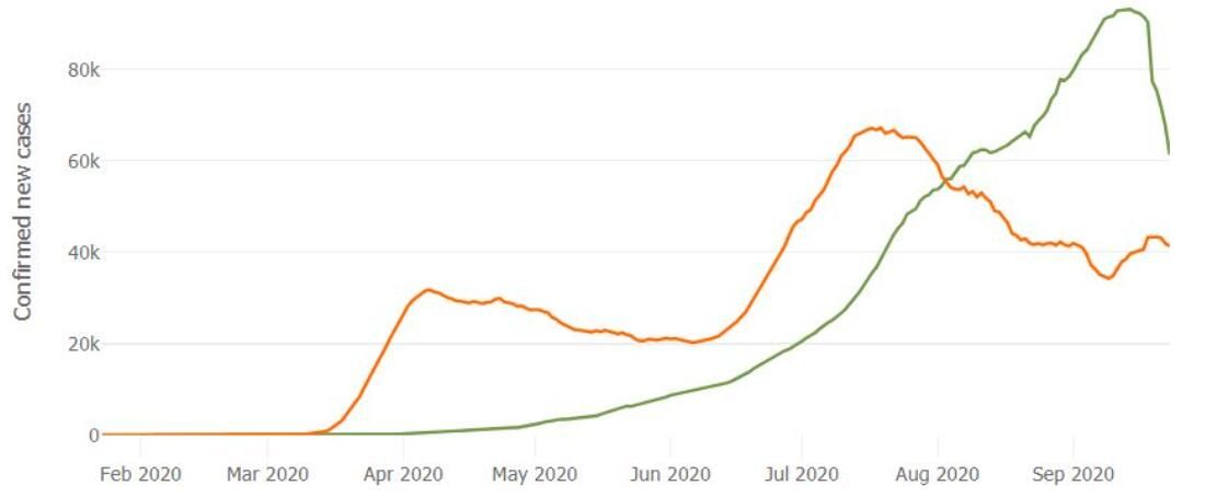 印度(绿色)和美国(橙色)的每日新增确诊病例数量变化(以7天平均值计算)。 美国约翰斯·霍普金斯大学网站 图