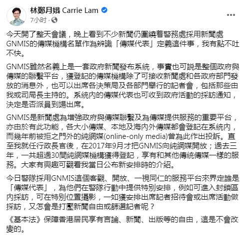 在贴文中,林郑月娥表示,今天(24日)开了整天会议,晚上看到不少新闻仍围绕着警务处采用新闻处GNMIS(政府新闻处新闻发布系统)的传媒机构名单作为辨识“传媒代表”定义这件事,她说“有点不吐不快”。