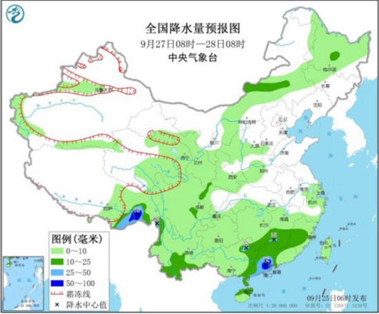 27日,江南南部、云南西部和南部、华南中部和南部、四川盆地西部、西藏东南部、内蒙古中部等地部分地区有中到大雨,其中,广东南部、西藏东南部等地部分地区有暴雨。