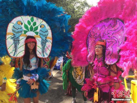 资料图:当地时间2020年2月25日,在巴西圣保罗,两位女子盛装参加街头狂欢活动。一年一度的巴西狂欢节2月21日晚开幕,巴西各大城市进入了“狂欢节时间”。中新社记者 莫成雄 摄