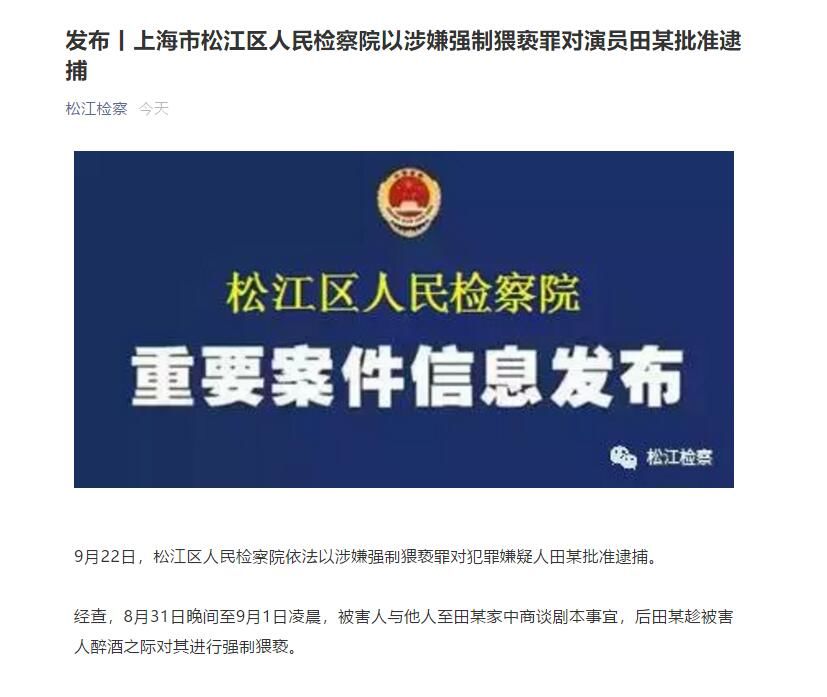 荔枝新闻讯 据松江检察官方微信消息,9月22日,上海市松江区人民检察院依法以涉嫌强制猥亵罪对犯罪嫌疑人田某批准逮捕。