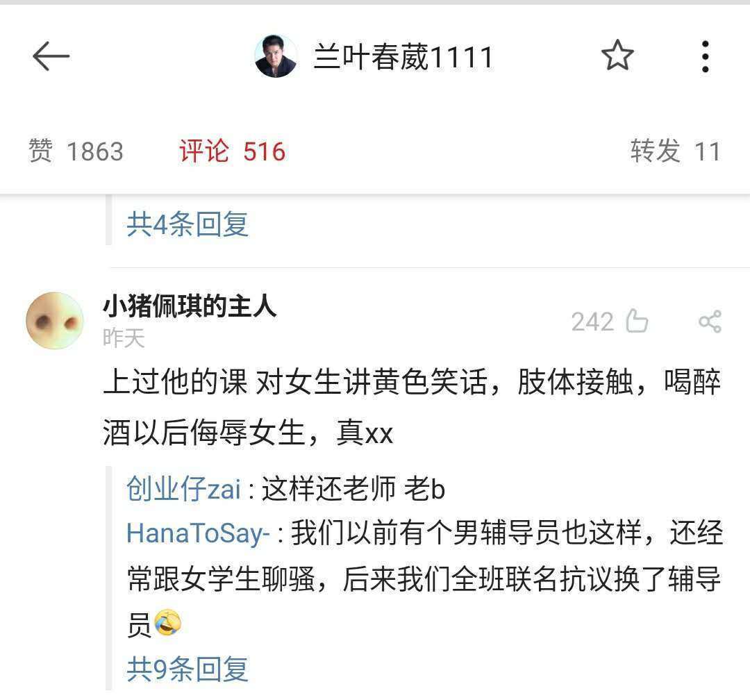 一位叫“小猪佩琪的主人”的网友评论:“上过他的课,对女生讲黄色笑话,肢体接触,喝醉酒以后侮辱女生。”