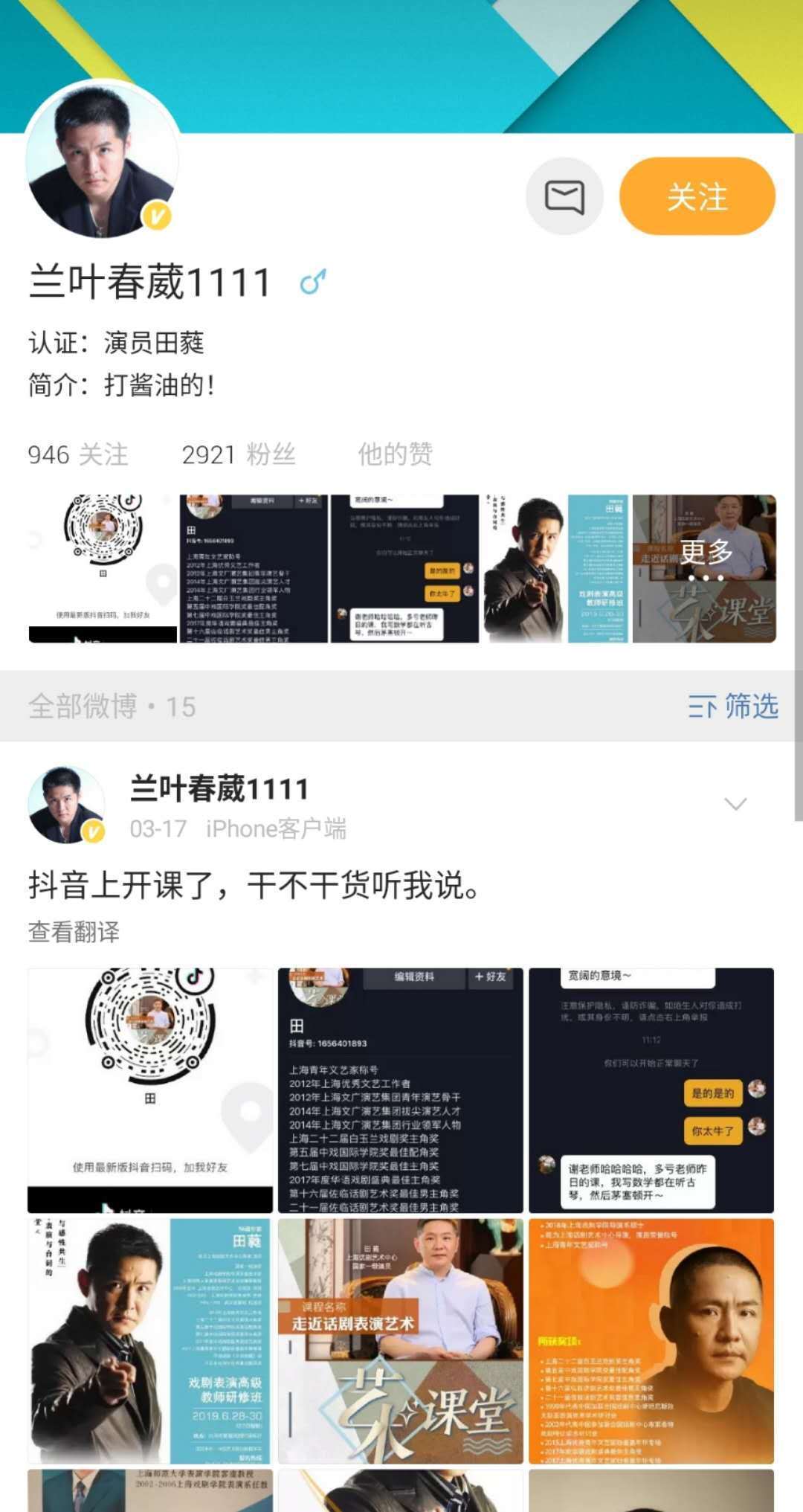 田蕤的微博名为“兰叶春葳1111”,在新冠肺炎疫情期间,他还在抖音上开课。有网友评论:“他微博上关注的尽是些小女生”。封面新闻记者翻阅发现,田蕤关注的900多位微博网友中,头像为女性的居多,不少是卡通头像。