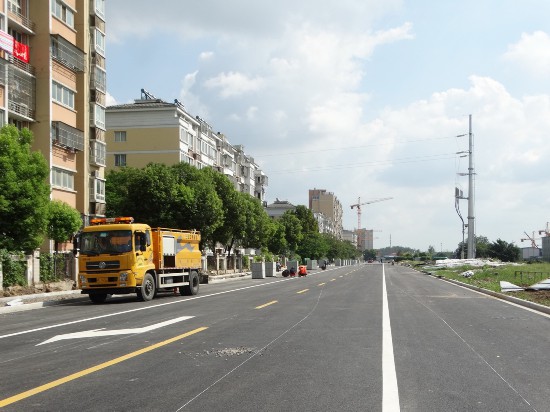 跃进河路是广陵区东南片区一条东西向道路,位于跃进河北侧。据施工人员介绍,跃进河路按城市支路标准建设,设计行车速度30公里/小时。工程西起大学南路,向东至九龙河,道路全长571米。目前道路面层沥青已经摊铺完成,道路已经画线,施工人员正在进行路边绿化带树池及人行道道板铺设等施工,同时用专业车辆冲洗下水管道,整个建设工程已进入最后扫尾阶段。