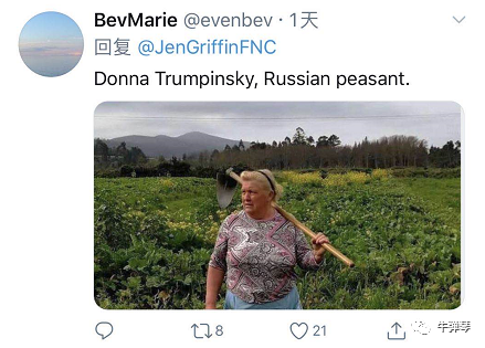反正,在美国社交媒体上,不少美国人就ps了“俄罗斯农民”的照片,然后恍然大悟:原来马克龙是话里有话啊,俄罗斯农民,难不成就是美国总统,名叫特朗普斯基……