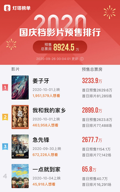 三天前,国庆档影片正式开启统一预售,国庆档“逐鹿”就此真正开启。截至9月26日0时,国庆档影片累计预售总票房超8924万元,其中在预售票房和想看人数上《姜子牙》暂时领先。