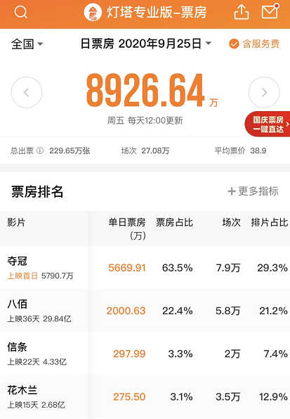 作为今年国庆档率先开打的第一部影片,《夺冠》势必备受市场关注。灯塔专业版显示,《夺冠》9月25日排片占比为29.3%,位列第一;其次为《八佰》排片占比为21.2%。