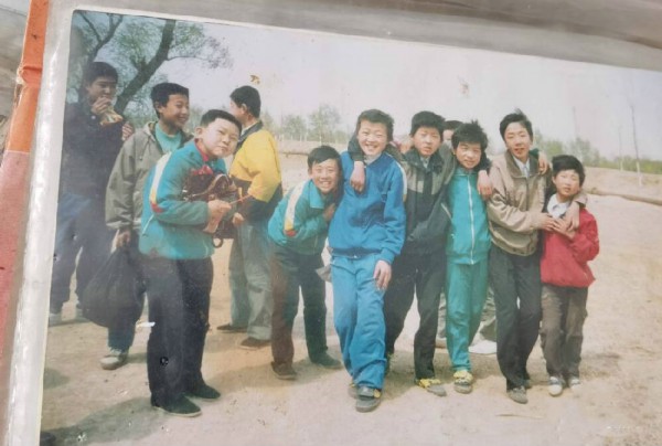 黄河老滩区一群80后小朋友的合影。他们刚从学校里出来,身穿蓝色校服,手拿书包,在打闹的瞬间拍下了这张合影。
