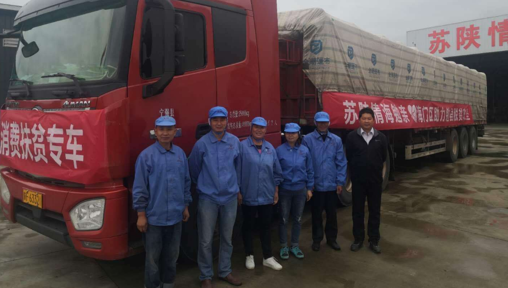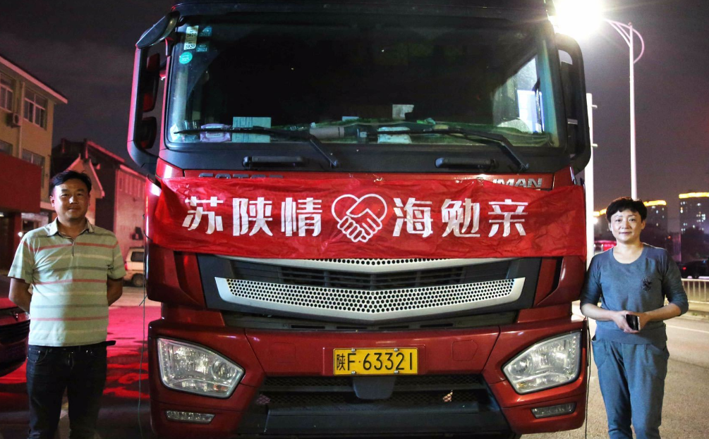 当晚9点,来自勉县的又一车农副产品运抵海门,原本不需要亲自验收的崔琪放心不下,还是赶来查看货物。开了四天四夜,安全抵达海门,整车货物完好无损,她也松了口气。货车车头挂着一张写着:“苏陕情 海勉情”的横幅,让现场的记者不禁动容。