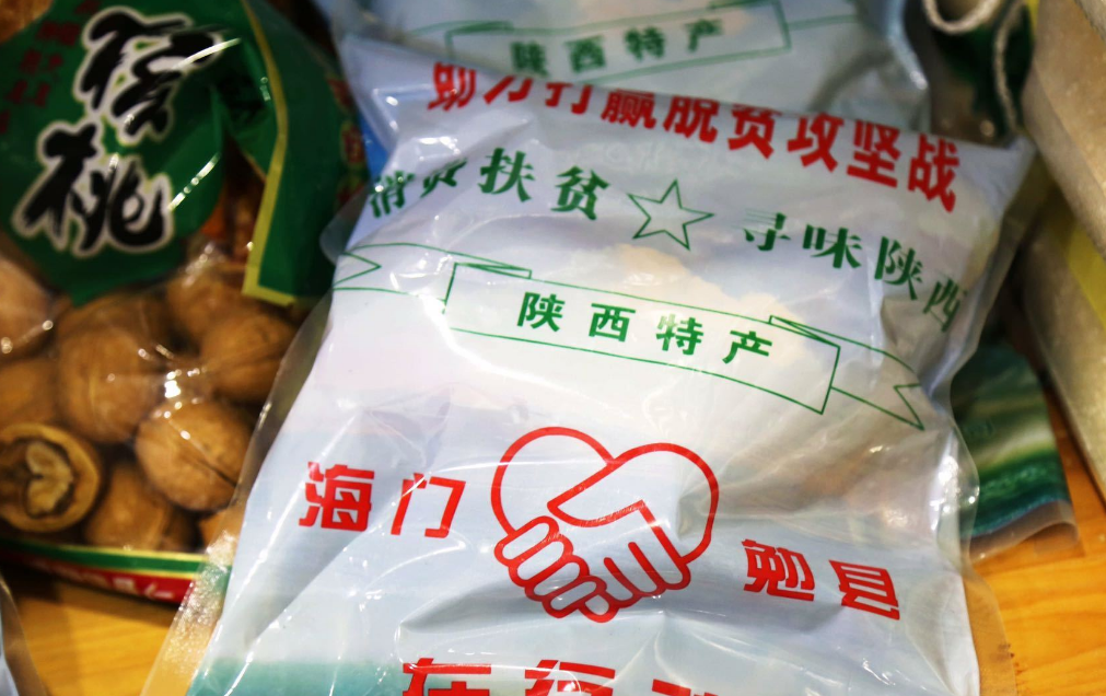 老板娘崔琪一边清点着货物,一边告诉我们。只见整个店里堆满了大米在内的各类农副产品,包装袋上都印着:支援助力打赢脱贫攻坚战和消费扶贫、寻味陕西的字样,其中将海门和勉县间用一只紧握着的红手作为logo图标,象征海勉人民永远手牵手、心连心,共富裕的信念。