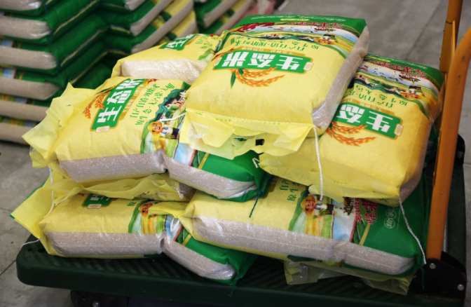 临近中秋,店里有些忙碌,工人们正在往小货车上搬运需要配送的货物。“现在打包的东西是送到学校的,大概有一百多袋大米以及配套的油、黑木耳、香菇、红枣等等。”