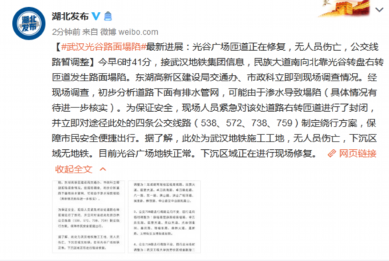 9月27日6时41分,接武汉地铁集团信息,民族大道南向北靠光谷转盘右转匝道发生路面塌陷。东湖高新区建设局交通办、市政科立即到现场调查情况。经现场调查,初步分析道路下面有排水管网,可能由于渗水导致塌陷(具体情况有待进一步核实)。为保证安全,现场人员紧急对该处道路右转匝道进行了封闭,并立即对途径此处的四条公交线路(538、572、738、759)制定绕行方案,保障市民安全便捷出行。据了解,此处为武汉地铁施工工地,无人员伤亡,下沉区域无地铁。目前光谷广场地铁正常。下沉区域正在进行现场修复。