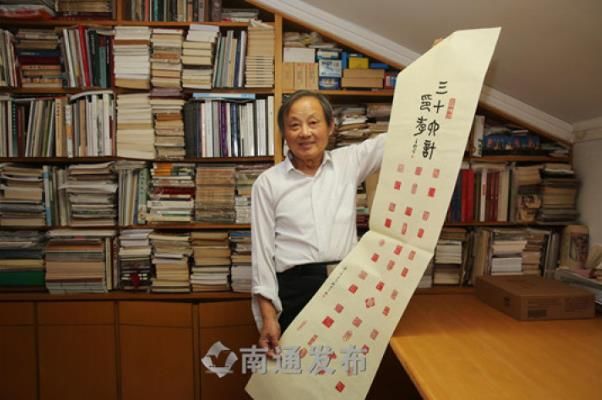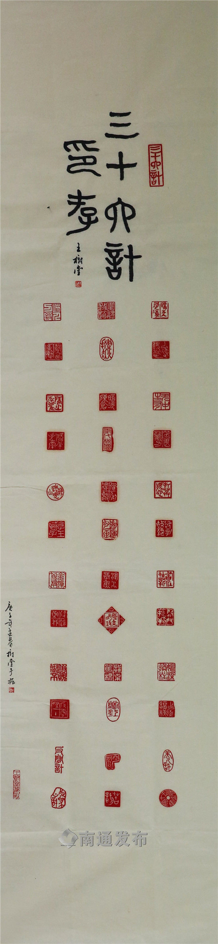 9月27日,记者在王树堂家中见到这幅《三十六计》篆刻作品。八尺竖幅宣纸上方写着“三十六计印存”小篆字体,字体左侧盖着一方《三十六计》朱文起首章。每组三方依次竖排,每方印面约2.5厘米见方,形状有正方形、长方形、圆形、椭圆形 、菱形和不规则形,整体布局和谐而富有变化。