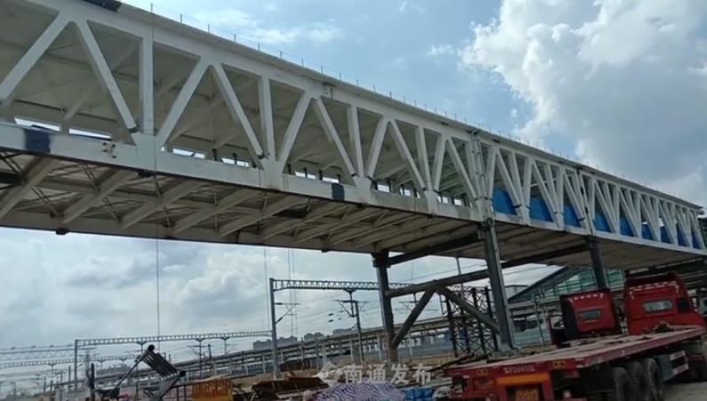 项目施工期间宁启铁路、新长铁路、海洋铁路仍正常运行,接触网距天桥最小距离仅1.43米,施工难度极大。中铁建工集团相关负责人介绍,就在半个月前,现场经过6个小时的紧张施工,海安站钢结构进站天桥成功顶推33.4米,这是目前为止中国铁路上海局管辖区段内,在既有营业线上,一次性顶推跨度最大的天桥施工。