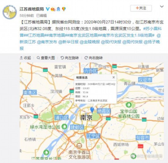 据江苏省台网测定:2020年09月27日14时30分,在江苏南京市玄武区(北纬32.08度、东经118.83度)发生1.8级地震,震源深度15公里。