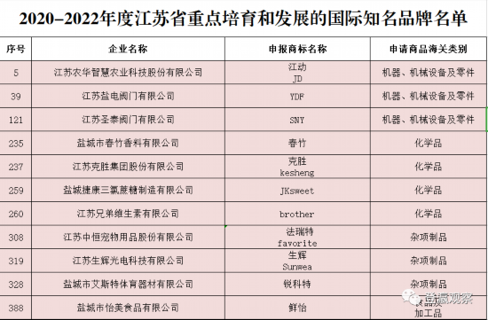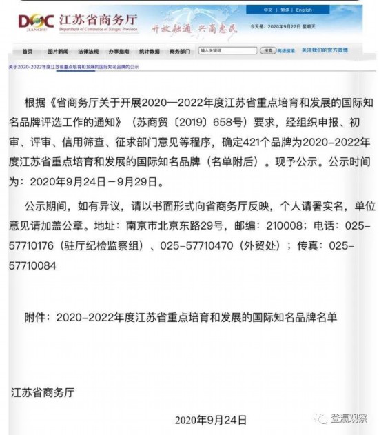 近日,江苏省商务厅公示了2020-2022年度江苏省重点培育和发展的国际知名品牌名单。