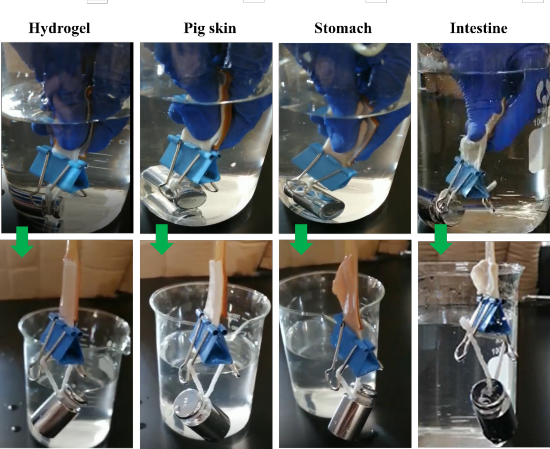 刘文广教授团队设计的该种水凝胶,通过使用寡聚糖对侧链含有羧基的水凝胶进行单面浸泡,寡聚糖与凝胶内部的羧基发生梯度复合,从而形成了一种在湿态下可快速实现对组织黏附的“两面神”水凝胶。刘文广教授介绍,含羧基的凝胶与寡聚糖直接接触的一面,因羧基几乎全部被复合而失去黏附性;而远离寡聚糖溶液的一面,则因在最外表面保留了自由羧基而具有黏附性,并且由于羧基和氨基的静电复合导致的相分离还赋予了该面疏水和排水的能力,因此,这一侧表面对生物软组织均显示出了优异的湿态黏附效果。