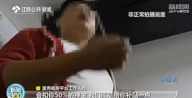 蛋壳租房平台工作人员称:“你要是担心,我们可以个人给你写保证书,我们自己给你做担保。你还不放心的话,你就只能两种方式,一种就是你退租,押金确实没有了。第二种就是你换一种付款方式,会扣你50%的押金,我们愿意给你补贴一点。”