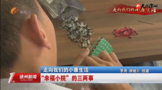于波波说的地方,是坐落于徐庄村村部西侧的残疾人之家"幸福小院"。在这个幸福小院,近30名残疾人围坐在一起,忙着组装电子插板。改变他们人生的人叫刘祥,省委驻丰县帮扶工作队队员、徐庄村第一书记,也是这个残疾人之家项目的发起人。