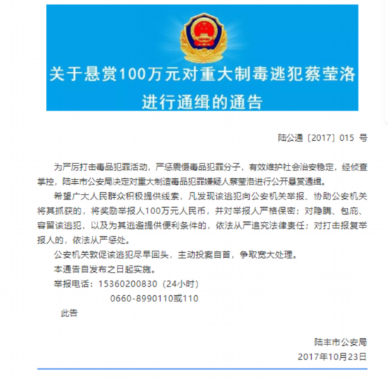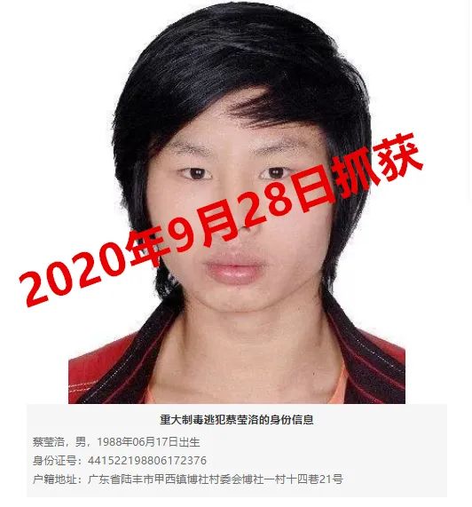 2020年9月28日16时许,在陆丰市公安机关的强力追逃下,根据群众举报,涉毒逃犯蔡莹洛(男,32岁,陆丰甲西人)被成功抓获归案。此前,陆丰市公安局曾对其悬赏100万进行通缉。