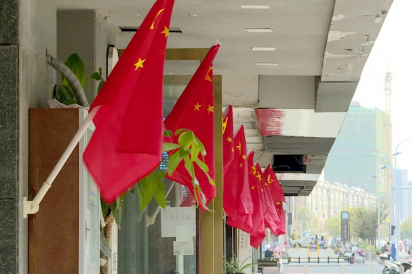 沿街商铺门前,商户们自发悬挂国旗,放眼望去,一排排整齐的五星红旗迎风招展,分外美丽。