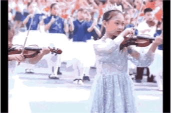 学生们个个精神抖擞,热情洋溢,手中挥舞着国旗,伴随着悠扬、动人的小提琴伴奏声和着轻快的舞步,大家深情演唱《我和我的祖国》。