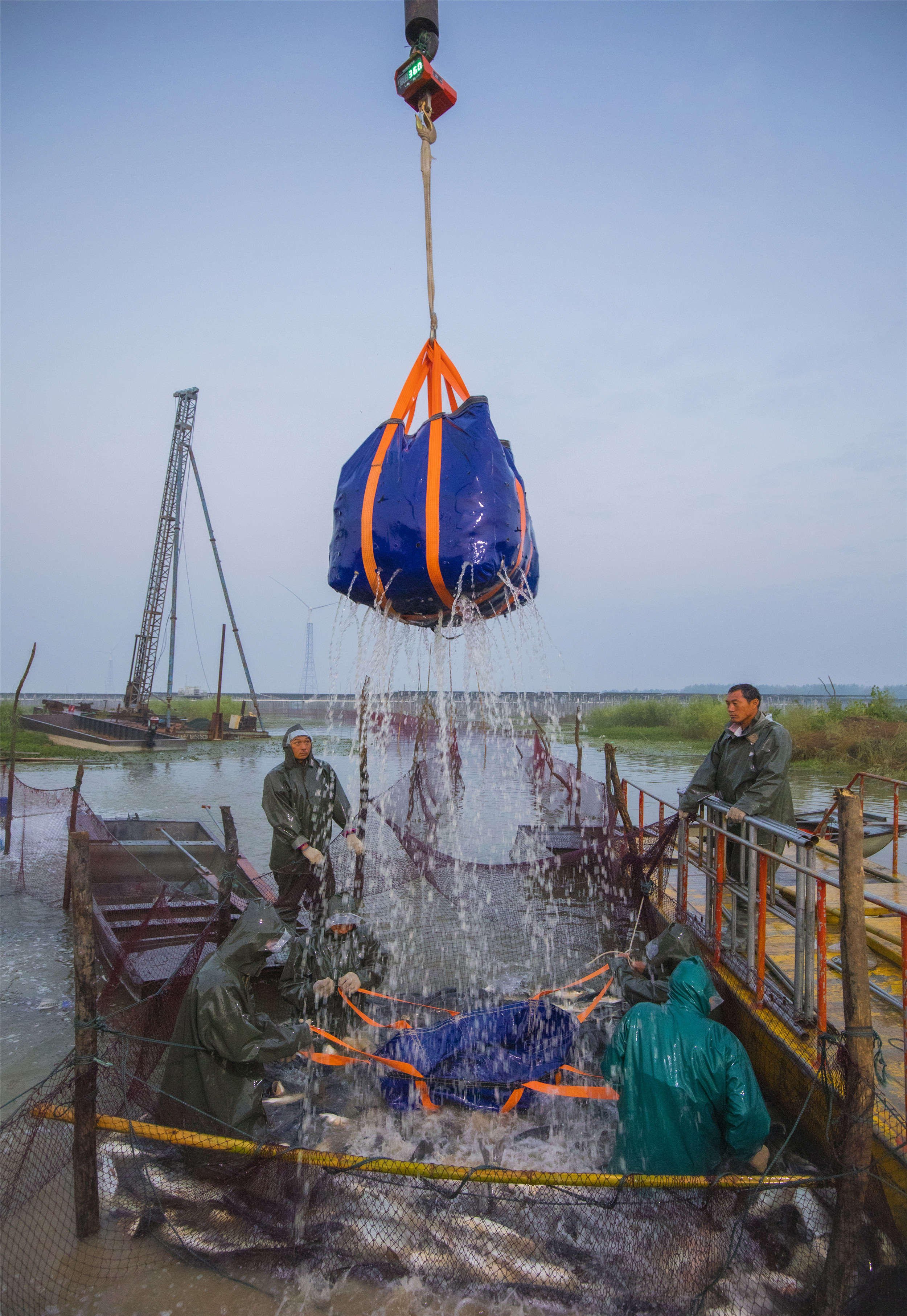 9月25日,宿迁市泗洪县天岗湖乡光伏应用领跑基地“光伏鱼”喜获大丰收。凌晨4点工作人员就开始捕鱼,供应国庆和中秋双节市场。