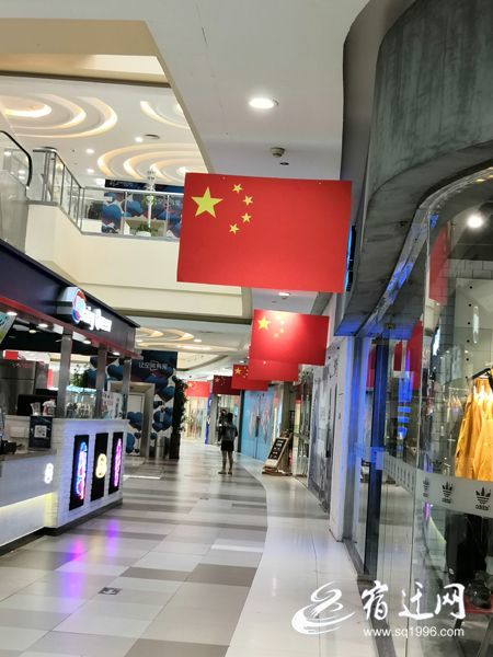 在商场里,商家们同样努力营造节日氛围。在市区宝龙城市广场一楼,悬挂着成排的国旗。一些珠宝店和空调专卖店里挂满了小号国旗,有的还挂红色的中国结,把店面装扮得特别喜庆。