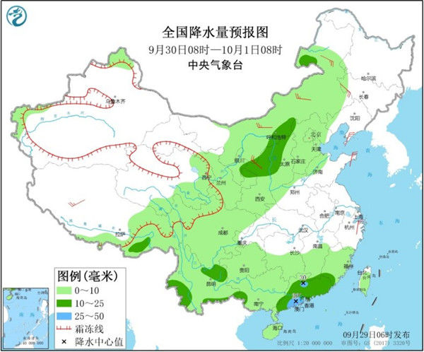 9月29日08时至30日08时,新疆沿天山地区及阿勒泰地区、西北地区中东部、华北大部、黑龙江北部、西南地区、江汉、江淮大部、江南、华南等地的部分地区有小到中雨或雨夹雪天气;其中广西西北部、广东北部和西南部沿海、海南岛西部等地局地有大雨或暴雨(50~80毫米);陕西北部、华北、辽东半岛、山东半岛等地的部分地区有4~6级风(见图1)。