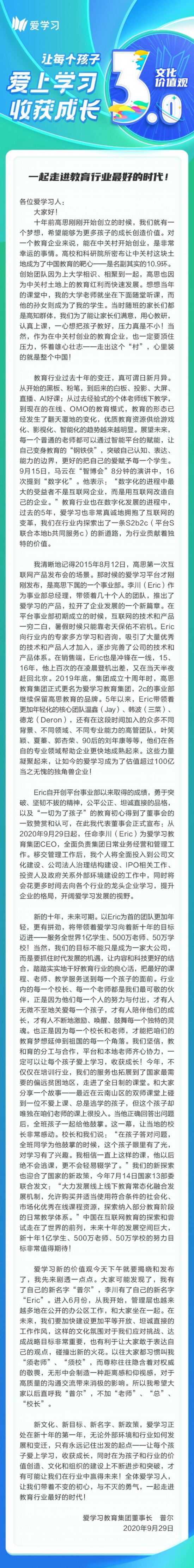 9月29日,爱学习教育集团发布人事任命通知,联合创始人、总裁李川升任爱学习教育集团CEO,全面负责集团日常业务经营和管理工作。
