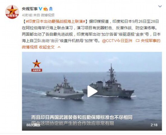 据印媒报道,印度和日本9月26日至28日在阿拉伯海举行海上联合演习,演习项目有武器射击、反潜作战、防空演练等。两国都出动了各自最先进战舰,印度海军出动“加尔各答”级驱逐舰“金奈”号,日本海上自卫队出动“出云”级直升机航母“加贺”号。