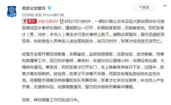 荔枝新闻讯 据北京公交警方通报,9月27日16时许,一辆921路公交车沿远大路由西向东行驶至海淀区长春桥东侧时,撞倒路边一灯杆,车辆轻度受损,无乘客受伤。司机张某才(男,39岁,本市人)离车步行至长春桥上跳下。接群众报警后,警方迅速赶到现场,协助急救人员将该人送往医院救治,当日22时许,张某才经抢救无效死亡。