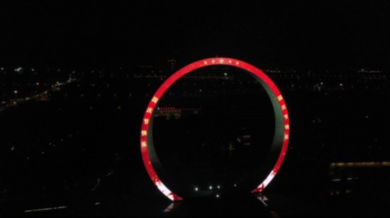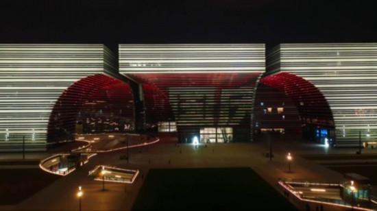城市新建地标文化广场,宏大的建筑外部立面和穹顶渲染成红色的海洋,灯光组成国庆主题图案滚动播放。
